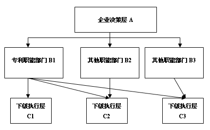 職能式專利管理組織架構(gòu)明顯不同于直線式架構(gòu),其專利管理部門位階已經(jīng)與其他職能部門相同,專利管理部門與企業(yè)內(nèi)部的行政、技術(shù)研發(fā)、新產(chǎn)品推廣、戰(zhàn)略部門等平行設(shè)置。其最大的特點(diǎn)是,專利管理部門可以直接向其他職能部門的下級(jí)管理層下達(dá)任務(wù)并聽取匯報(bào)。這樣就克服了直線式專利管理組織架構(gòu)中因某一產(chǎn)品的專業(yè)性太強(qiáng)而帶來的種種弊端。專利管理部門在新產(chǎn)品研發(fā)過程中,其作用更加明顯,例如:企業(yè)決策層A下達(dá)“防漏電熱水器”技術(shù)公關(guān)給職能部門B2,由下級(jí)執(zhí)行層C2執(zhí)行,下級(jí)執(zhí)行層C2接到任務(wù)后向?qū)@芾聿块TB1匯報(bào),該部門關(guān)注該技術(shù)攻關(guān)進(jìn)展,實(shí)時(shí)提供專利侵權(quán)檢索、規(guī)避涉及、專利申報(bào)、技術(shù)秘密保護(hù)等各方面服務(wù),做到避免重復(fù)研發(fā),防止未來侵權(quán)風(fēng)險(xiǎn)等方面具有重大作用。