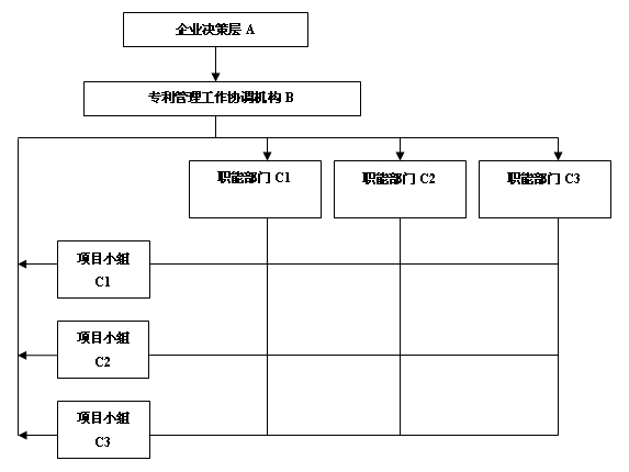 矩陣式專利管理組織架構(gòu)吸收了直線式和職能式組織架構(gòu)的優(yōu)點(diǎn),并相應(yīng)的提高了專利管理層的位階,成為企業(yè)決策層的單獨(dú)協(xié)調(diào)機(jī)構(gòu)供企業(yè)發(fā)展決策參考,甚至參與企業(yè)發(fā)展戰(zhàn)略討論和決策。