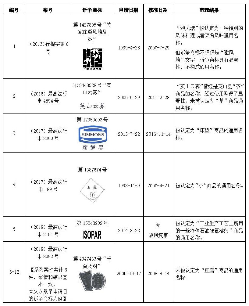 筆者查詢到最高人民法院案件,均為對已注冊的商標提出的無效宣告,法院均以商標申請時的客觀事實狀態為判斷標準。如最高人民法院審理的“席夢思”商標案件中,法院認定以商標申請日時的事實狀態為準,相關公眾普遍認為席夢思能夠指代床墊商品。最高人民法院審理的“千葉”商標案件中,裁定書也有類似的記載“清美公司明確主張,訴爭商標在申請注冊時即構成一種特定豆腐制品的通用名稱”。