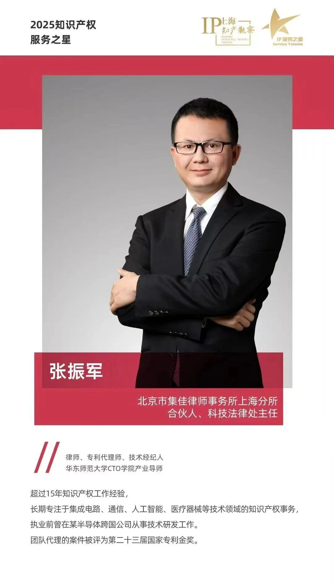 集佳上海分所張振軍律師憑借卓越的服務(wù)能力與良好的客戶口碑獲評(píng)“2025知識(shí)產(chǎn)權(quán)服務(wù)之星”。