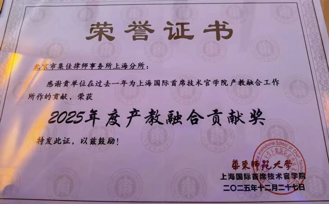 在頒獎典禮環節,北京市集佳律師事務所上海分所獲得2025年度產教融合卓越貢獻獎。